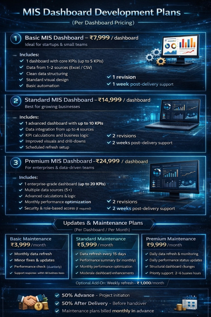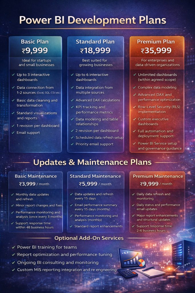 Our pricing is designed to be transparent, flexible, and aligned with your business needs. Each service is scoped based on complexity, data volume, and customization requirements, ensuring you pay only for what you need.